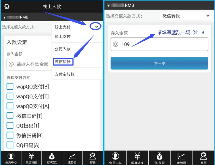 登入账号后,点击屏幕下方导航中的存/取款--存款,再点击右上角充值方式下拉菜单--选择微信转账,并填写存入金额。注:此处存入金额只支持整数,不支持小数点。
